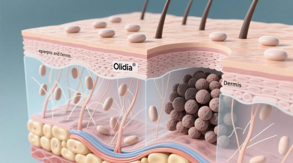 الجزيئات غير المنتظمة قد تحفز استجابة التهابية من الجهاز المناعي، مما يسبب احمرارًا أو تورمًا أو حتى تكوّن عقد تحت الجلد. تصميم Olidia البيضاوي يقلل من هذا التفاعل، مما يقلل من خطر الالتهابات والآثار الجانبية مثل النودلز (nodules). أظهرت الدراسات السريرية أن الجزيئات البيضاوية تقلل التفاعلات الالتهابية بشكل ملحوظ (5).